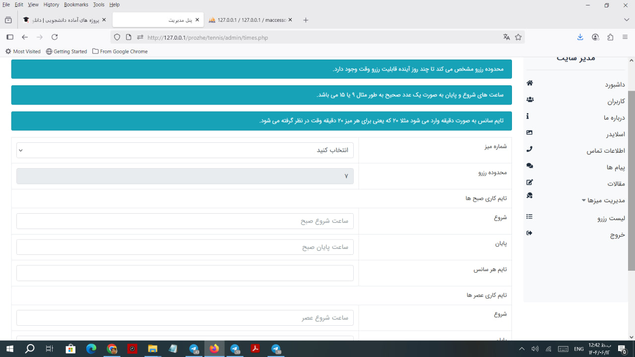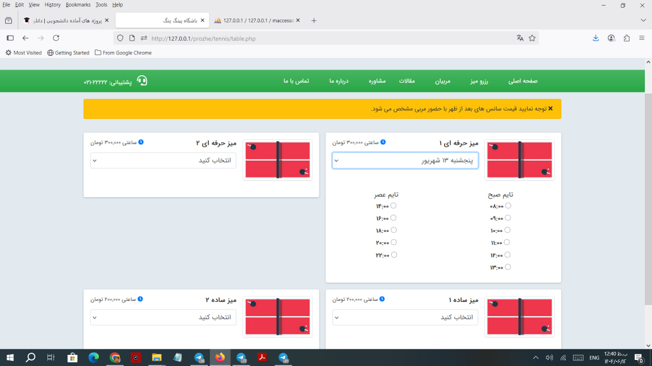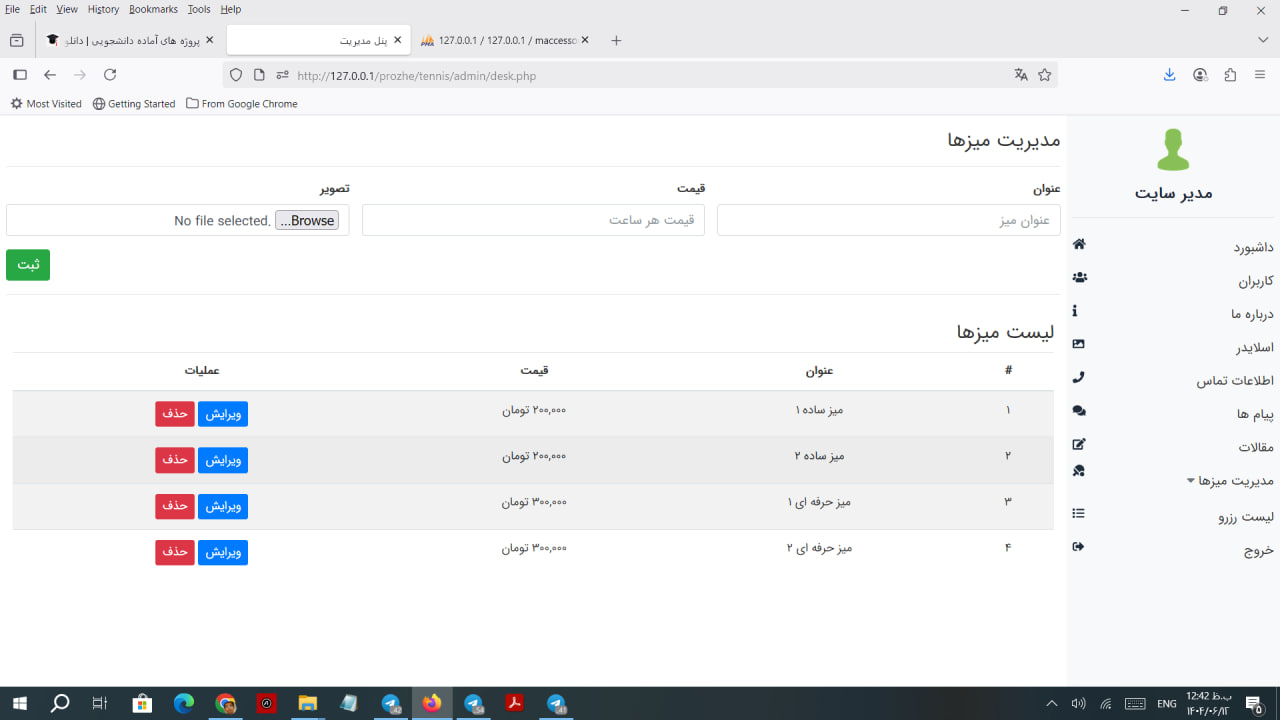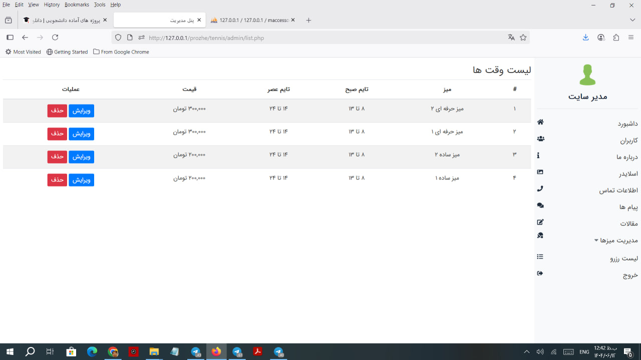 مدیر سایت از بخش مدیریت می توانند انواع میزها را تعریف کرده و برای هر سانس یا میز زمان و قیمت را تعیین نماید.