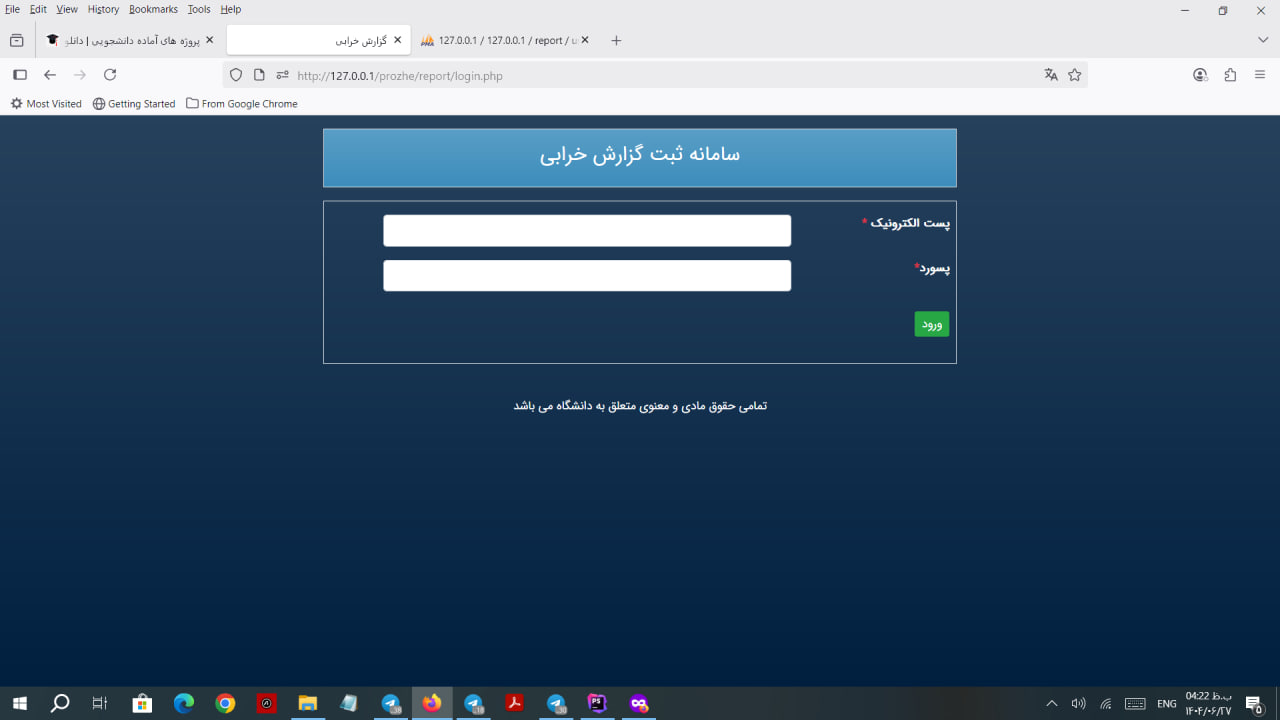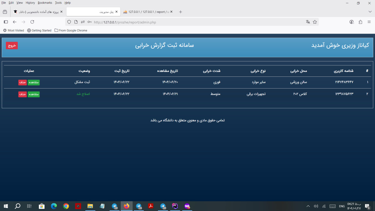 با استفاده از این پنل مدیریتی که به صورت یک سایت طراحی شده است به عنوان یک دانشجو می توانید موارد خرابی یا مشکل دار در تجهیزات یا لوازم دانشگاه را به مدیریت اطلاع دهید.