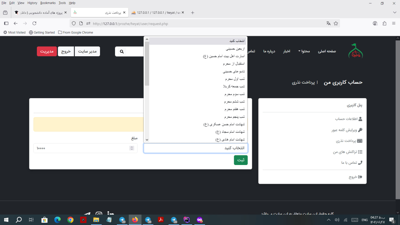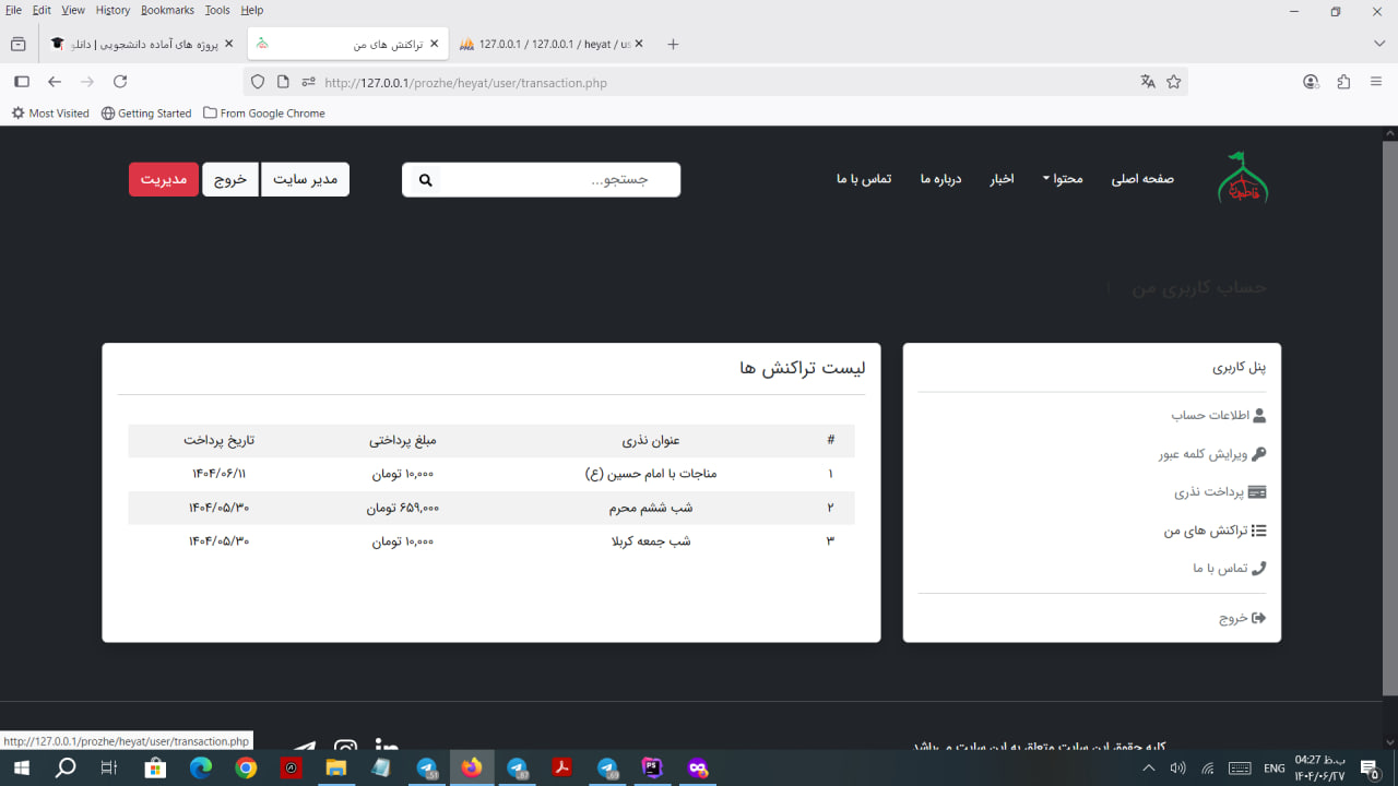 ویژگی متمایز این سایت، داشتن صفحه شخصی کاربران است که از طریق آن میتوانند به راحتی نذریهای خود را بهصورت آنلاین و از درگاه پرداخت امن انجام دهند. پس از پرداخت، کاربران میتوانند لیست پرداختها و جزئیات نذریها را مشاهده کرده و از طریق سیستم گزارشگیری پیشرفته بر اساس تاریخ و نوع نذر، اطلاعات دقیقی دریافت کنند.