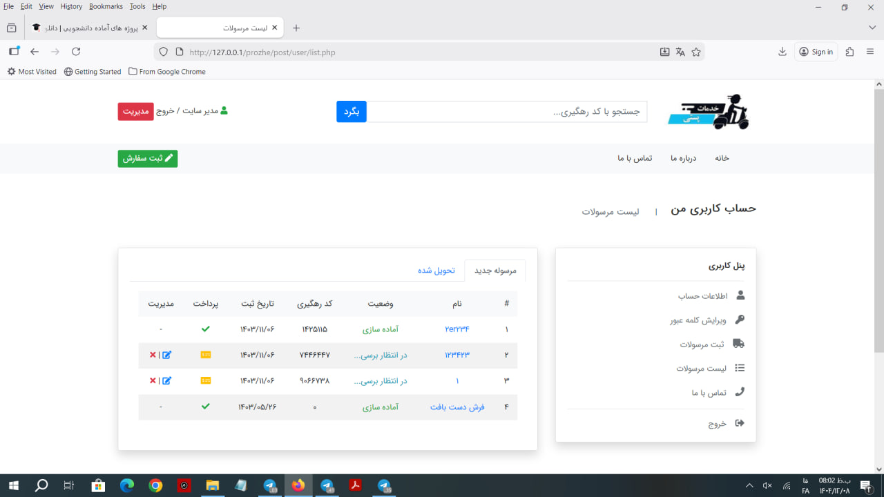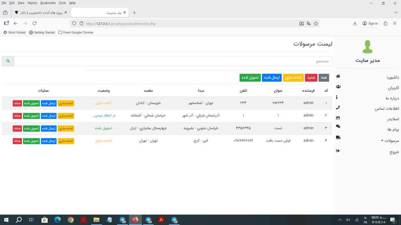 مدیریت سایت توانایی مدریتی تمامی بخش هارا دارا می باشد و از بخش مدیریت میتواند وضعیت مرسولات را تغییر دهد.
